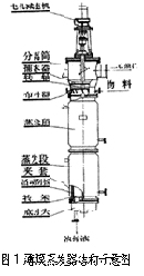 物料由設在分離筒身下端的入口切向進入蒸發器,并經安裝在分離筒身內的布料器被連續均勻地分布于蒸發筒身內壁,從蒸發筒身蒸發出的二次蒸汽上升至分離筒,經安裝在內的氣液分離器,將二次蒸汽可能挾帶的液滴或泡沫分離,二次蒸汽從上端的出口引出蒸發器。